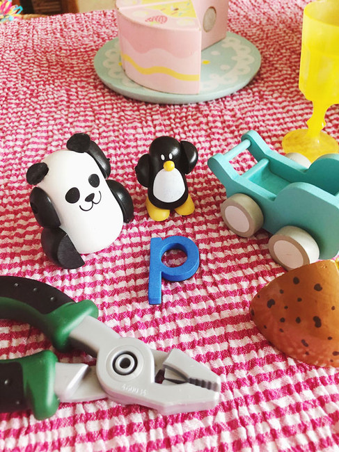 A selection of objects beginning with p e.g. pushchair, panda, penguin, potato, pliers (Or click here to download some photos of objects)