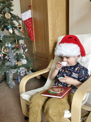 I also added a notebook and pen which we pretended was the nice list. Benji took his role as Father Christmas very seriously. After his drink and biscuits he settled down to have a look at the list. He made a note of the children and the present that they asked for. This just looked like scribbles in the books but he was giving meaning to his marks. I pretended to be an elf and he told me which presents to wrap.